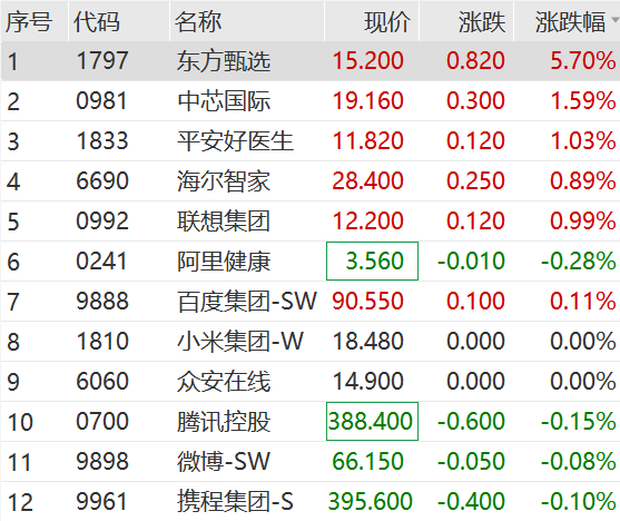 港股三大指数早间小幅高开,恒生指数涨0.13%,恒生科技指数涨0.16%,恒生国企指数涨0.12%。开盘不久后,港股由红转绿,东方甄选逆势走高,领涨恒生科技。